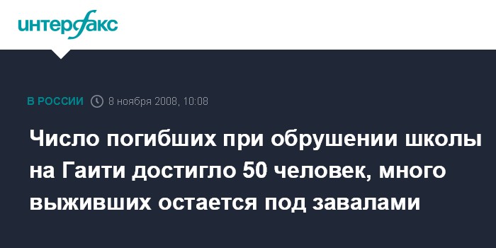 Москва. 8 ноября. INTERFAX.RU - По последним данным, 50 человек погибли, более 120 получили ранения в результате обрушения трехэтажного здания школы в пригороде столицы Гаити Порт-о-Пренса