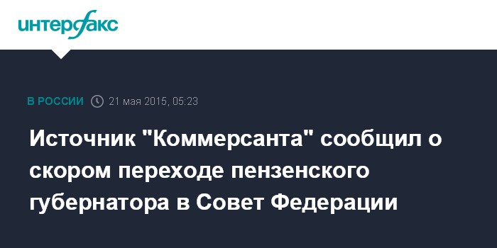 Москва. 21 мая. INTERFAX.RU - Глава Пензенской области Василий Бочкарев, срок полномочий которого истекает 25 мая, может занять вакантный пост в Совете Федерации, пишет "Коммерсант" в четверг.