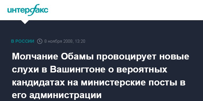 Москва. 8 ноября. INTERFAX.RU - Избранный президентом США Барак Обама, вопреки ожиданиям, не стал озвучивать назначения в своей администрации на первой после выборов пресс-конференции, тогда как Вашингтон продолжают будоражить слухи о том, кто может занять тот или иной пост.
