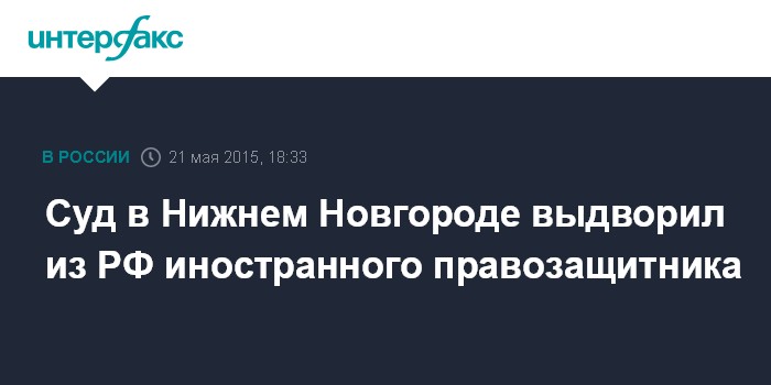 Москва. 21 мая. INTERFAX.RU - Сормовский районный суд Нижнего Новгорода в четверг постановил выдворить из РФ еще одного сотрудника Датского института против пыток, проводивших в городе тренинги для правозащитников, сообщил представитель райсуда агентству "Интерфакс".