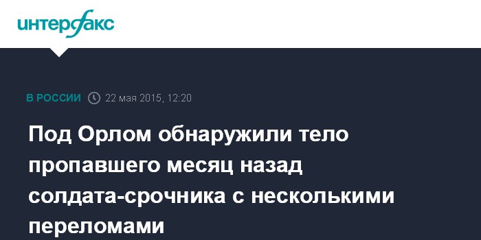 Москва. 22 мая. INTERFAX.RU - Следственные органы возбудили уголовное дело по факту смерти солдата-срочника в Орловской области, чье тело было обнаружено спустя месяц после его исчезновения, сообщает пресс-служба СУ СКР по региону.