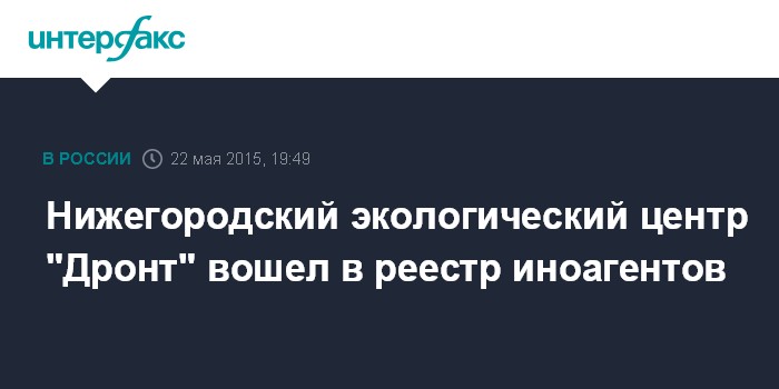 "В соответствии с Федеральным законом "О некоммерческих организациях" 22.05.2015 в реестр некоммерческих организаций, выполняющих функции иностранного агента, включена Нижегородская региональная общественная организация "Экологический центр "Дронт"", - говорится в сообщении ведомства.