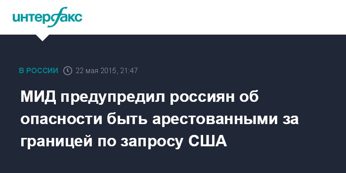 Москва. 22 мая. INTERFAX.RU - МИД РФ предупредил граждан РФ, что угроза подвергнуться задержанию или аресту по запросам правоохранительных органов и специальных служб США в третьих странах сохраняется.