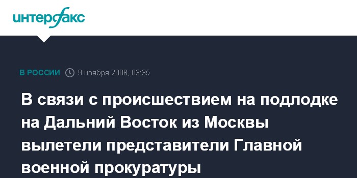 Москва. 9 ноября. INTERFAX.RU - По факту ЧП на атомной подводной лодке Тихоокеанского флота военная прокуратура начала проверку. Как сообщил "Интерфаксу" представитель Главной военной прокуратуры Михаил Яненко, по указанию главного военного прокурора Сергея Фридинского на Дальний Восток из Москвы вылетела группа офицеров Главной военной прокуратуры.