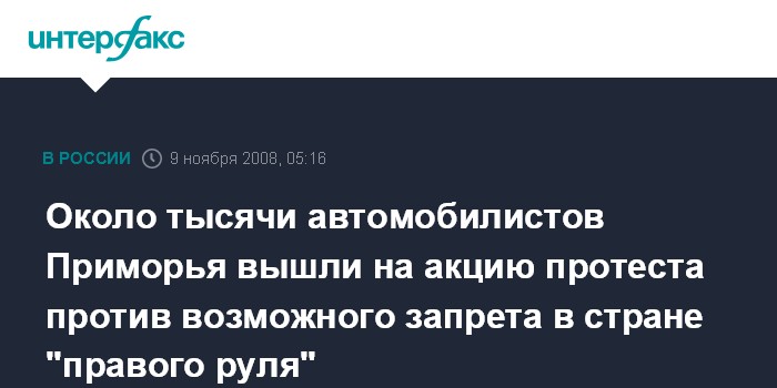 Москва. 9 ноября. INTERFAX.RU - Активисты сразу нескольких общественных движений Приморья, в том числе движения по защите прав автомобилистов края и простые автовладельцы вышли в воскресенье на акцию протеста против возможного запрета в стране эксплуатации машин с правым рулем и новые таможенные ограничения.