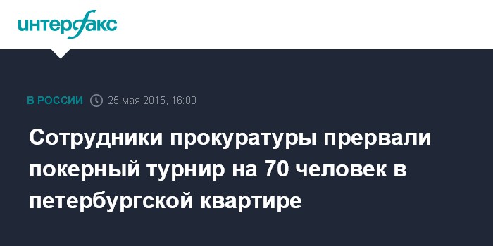Москва. 25 мая. INTERFAX.RU - Прокуратура Петербурга решает вопрос о возбуждении уголовного дела после проверки одной из квартир, где несколько десятков человек играли в покер в ходе подпольного турнира, сообщает пресс-служба ведомства в понедельник.