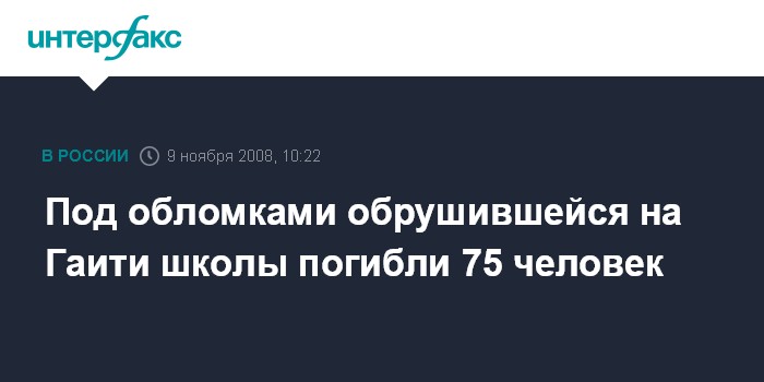 Лондон. 9 ноября. INTERFAX.RU - По последним данным, 75 человек погибли, более 120 получили ранения в результате обрушения трехэтажного здания школы в пригороде столицы Гаити Порт-о-Пренса.