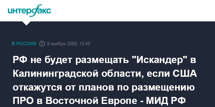 "Есть очень важный момент - эти меры (размещение комплексов "Искандер" в Калининградской области - ИФ) будут осуществлены только в случае, если будет развернута система ПРО США. Если США не станут ее развертывать, то отпадет сама необходимость принятия мер предосторожности с российской стороны", - сказал он в интервью "Интерфаксу" в воскресенье.