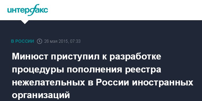 Москва. 26 мая. INTERFAX.RU - Минюст России приступил к выработке процедуры пополнения реестра нежелательных иностранных организаций, закон о которых подписал на минувшей неделе президент РФ Владимир Путин, сообщили во вторник в пресс-службе министерства.