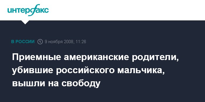 Москва. 9 ноября. INTERFAX.RU - Американцы Роберт и Бренда Мэтти убившие приемного русского мальчика Виктора Тулимова вышли на свободу, сообщает телеканал "Вести".
