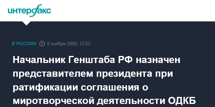 Москва. 9 ноября. INTERFAX.RU - Президент России Дмитрий Медведев назначил начальника Генштаба - первого замминистра обороны Николая Макарова своим официальным представителем при рассмотрении палатами Федерального Собрания вопроса о ратификации соглашения о миротворческой деятельности Организации Договора о коллективной безопасности, сообщила пресс-служба Кремля.