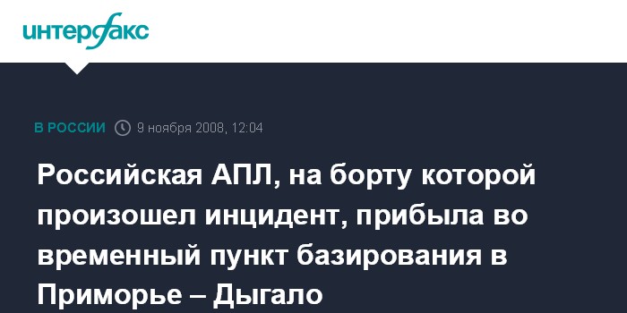 Москва. 9 ноября. INTERFAX.RU - Российская атомная подводная лодка, на борту которой произошел инцидент, в результате которого погибли люди, прибыла во временный пункт базирования в Приморье, сообщил помощник главнокомандующего ВМФ РФ Игорь Дыгало в воскресенье.