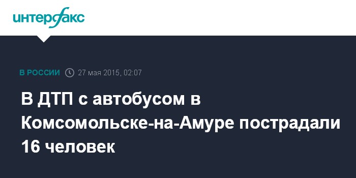 Москва. 27 мая. INTERFAX.RU - Во вторник днем в Комсомольске-на-Амуре произошло ДТП с участием рейсового автобуса, в котором пострадали 16 человек, сообщили в УМВД по Хабаровскому краю.