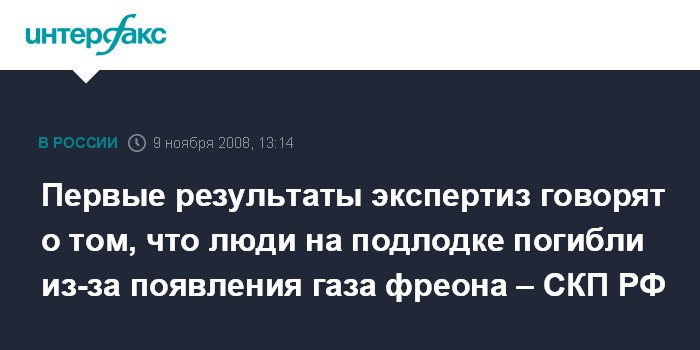 Москва. 9 ноября. INTERFAX.RU - Причиной смерти людей на российской атомной подводной лодке в Японском море, по предварительным данным, стал газ фреон, который появился в результате срабатывания системы пожаротушения.