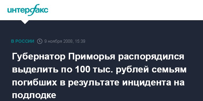 Владивосток. 9 ноября. INTERFAX.RU - Семьи погибших в результате инцидента на российской атомной субмарине в Японском море получат материальную помощь из резервного фонда Приморского края.