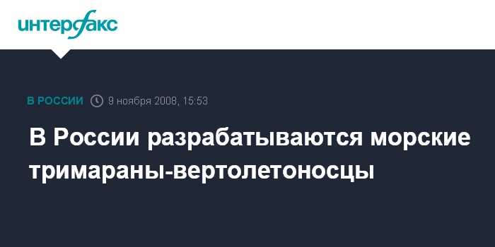 Москва. 9 ноября. INTERFAX.RU - В России продолжаются работы по разработке кораблей-тримаранов, способных нести на своем борту тяжелые вертолеты типа Ка-27, сообщил "Интерфаксу-АВН" главный конструктор ОАО "Зеленодольское ПКБ" Станислав Руденко.