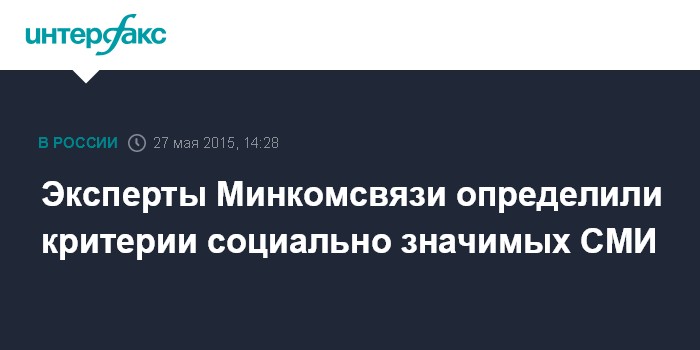 Москва. 27 мая. INTERFAX.RU - Экспертный совет при Минкомсвязи РФ определил и утвердил критерии социально значимых российских СМИ.