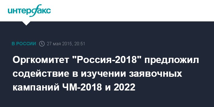 Москва. 27 мая. INTERFAX.RU - Оргкомитет чемпионата мира по футболу 2018 года в России готов оказать максимальное содействие всем заинтересованным органам по вопросам изучения обстоятельств заявочных кампаний за право проведения чемпионатов мира 2018 и 2022 годов, говорится в заявлении Оргкомитета в связи с расследованием обстоятельств процедуры выборов ЧМ-2018 и ЧМ-2022.