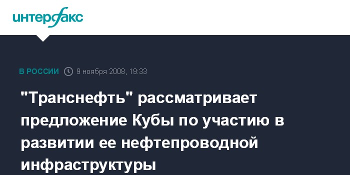 Гавана.9 ноября. ИНТЕРФАКС - Куба предлагает "Транснефти" участвовать в развитии нефтепроводной инфраструктуры на ее территории, сообщил журналистам глава компании Николай Токарев.