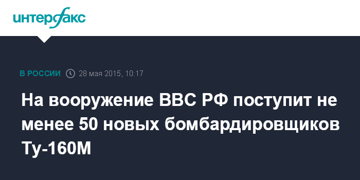 Москва. 28 мая. INTERFAX.RU - Военно-воздушные силы России закупят как минимум 50 новых стратегических бомбардировщиков Ту-160М, производство которых в настоящее время возобновляется, заявил главнокомандующий ВВС генерал-полковник Виктор Бондарев.