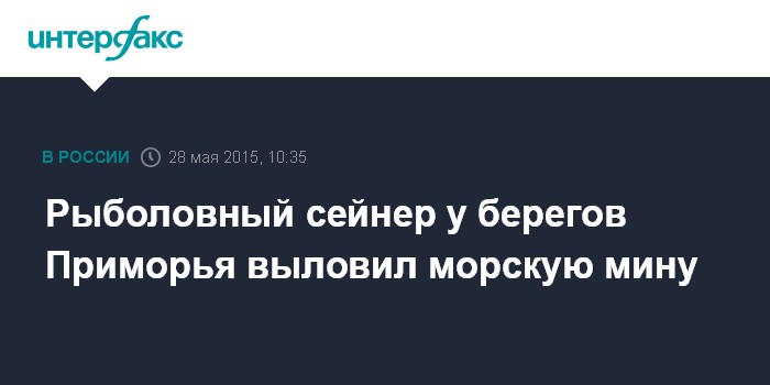 "В ночь на 28 мая рыболовный сейнер (РС) "Таймень", принадлежащий ГК "Доброфлот", осуществлял прибрежный промысел в районе Находки. 28 мая судно подошло к пирсу N3 берегового завода в поселке Южно-Морском для сдачи рыбы. В ходе выгрузки улова экипаж обнаружил в бункере среди выловленной рыбы металлический предмет, напоминающий морскую мину", - говорится в сообщении.