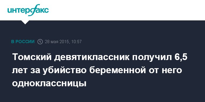 Москва. 28 мая. INTERFAX.RU - Октябрьский суд Томска признал школьника виновным в убийстве своей беременной одноклассницы и приговорил его к 6 годам и 7 месяцам воспитательной колонии, сообщает в четверг пресс-служба областного суда.