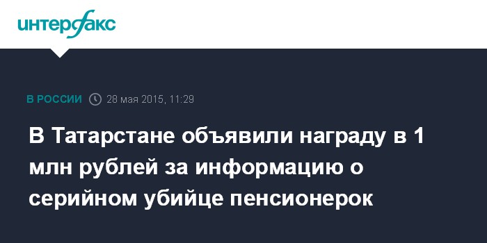 Москва. 28 мая. INTERFAX.RU - Следственные органы просят жителей Татарстана оказать содействие в поимке маньяка, на счету которого свыше 30 убийств одиноких пенсионерок.