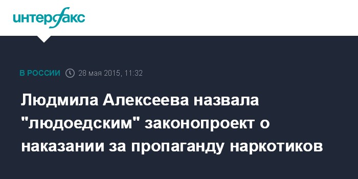 Москва. 28 мая. INTERFAX.RU - Член президентского Совета по правам человека, глава Московской Хельсинкской группы Людмила Алексеева раскритиковала законопроект о введении уголовной ответственности за пропаганду наркотиков.