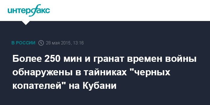 Москва. 28 мая. INTERFAX.RU - Сотрудники ФСБ ликвидировали в Крымском районе Краснодарского края схроны "черных копателей" с боеприпасами времен Великой Отечественной войны, масса взрывчатки оценивается в 70 кг в тротиловом эквиваленте, сообщили в пятницу "Интерфаксу" в группе общественных связей краевого УФСБ.