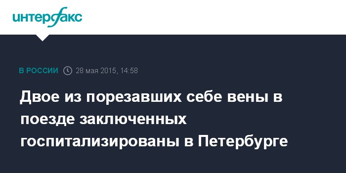 Москва. 28 мая. INTERFAX.RU - Двое из 15 заключенных, порезавших себе вены в спецвагоне поезда по дороге через Петербург, госпитализированы; травмы не угрожают их жизням, сообщили "Интерфаксу" в УФСИН по северной столице в четверг.
