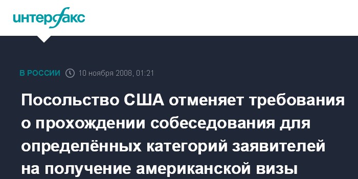 "Некоторым категориям заявителей, обращающимся за неиммиграционными визами США, не потребуется проходить собеседование при обращении за визой в посольстве США в Москве или в генеральных консульствах в Санкт-Петербурге, Екатеринбурге и Владивостоке", - сообщила пресс-служба американской дипмиссии.