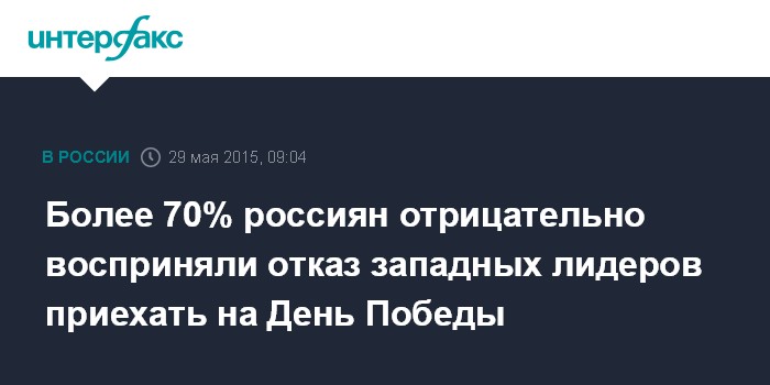 Москва. 29 мая. INTERFAX.RU - Отказ руководителей большинства западных стран принять участие в праздновании Дня Победы в Москве россияне восприняли негативно: 22% - с непониманием, 19% - с осуждением, 16% - с сожалением, 14% - с возмущением, сообщили "Интерфаксу" в "Левада-Центре".