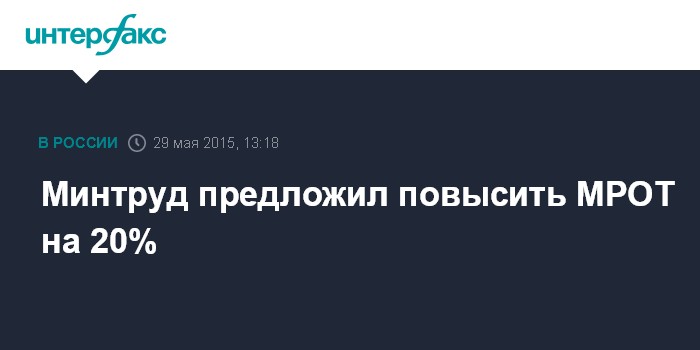 Москва. 29 мая. INTERFAX.RU - Минтруд РФ выступает с предложением повысить с 1 января 2016 года уровень минимального размера оплаты труда (МРОТ) более чем на 20%.