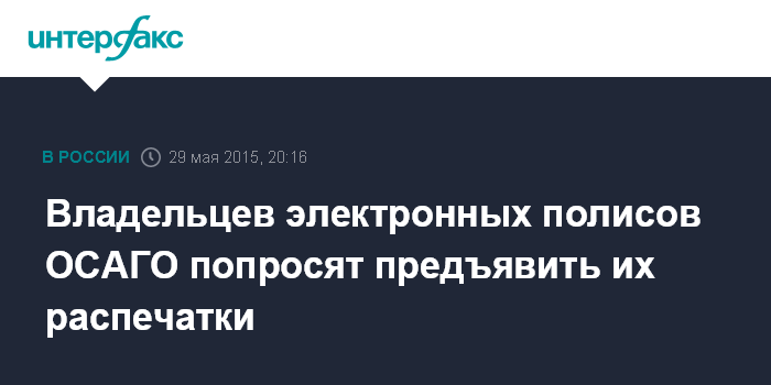 Москва. 29 мая. INTERFAX.RU - После введения с 1 июля 2015 года электронных полисов обязательного страхования автогражданской ответственности (ОСАГО) водителям необходимо будет иметь при себе либо полис ОСАГО старого образца, напечатанный на бланке строгой отчетности, либо распечатку электронного полиса - по аналогии с тем, как оформляются авиабилеты.