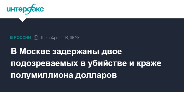 Москва. 10 ноября. INTERFAX.RU - Сотрудники правоохранительных органов задержали в воскресенье утром на севере Москвы двух жителей столицы, которых подозревают убийстве 25-летнего мужчины и похищении принадлежащих ему $500 тыс., сообщил "Интерфаксу" источник в правоохранительных органах города в понедельник.