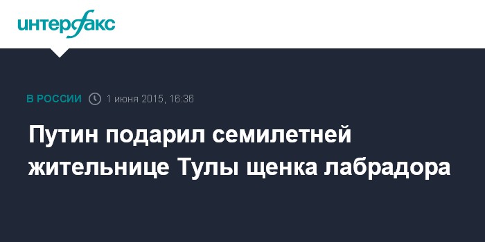 Москва. 1 июня. INTERFAX.RU – Юная жительница Тулы Эвелина Савушкина получила на день рождения щенка лабрадора от президента России Владимира Путина, сообщила пресс-служба областного правительства в понедельник.