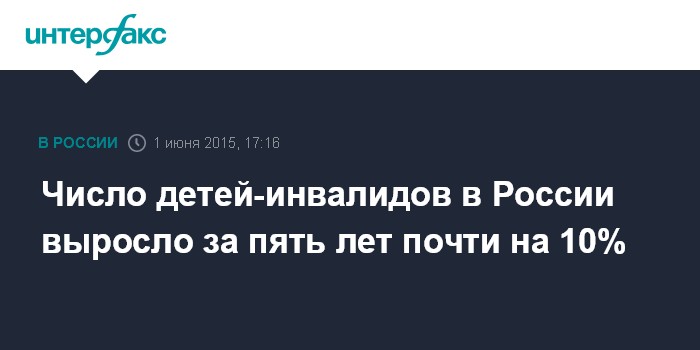 Москва. 1 июня. INTERFAX.RU - Число детей-инвалидов в России выросло на 3,7% в прошлом году по сравнению с 2013 годом, а за последние пять лет - на 9,2%, свидетельствуют данные, представленные уполномоченным при президенте РФ по правам ребенка Павлом Астаховым.