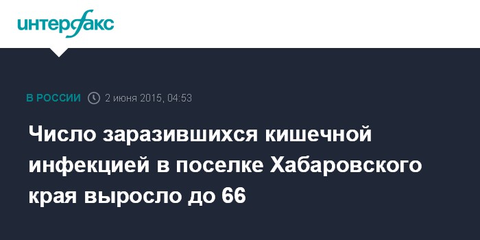 Москва. 2 июня. INTERFAX.RU - В поселке Многовершинный Хабаровского края выросло количество заразившихся из-за вспышки кишечной инфекции, сообщили во вторник "Интерфаксу" в управлении ЧС правительства региона.