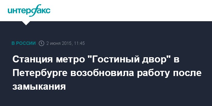 Москва. 2 июня. INTERFAX.RU - Станция метро "Гостиный двор" в Санкт-Петербурге открыта после получасового простоя, связанного с коротким замыканием в коллекторе.