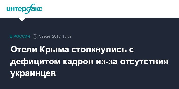 Москва. 3 июня. INTERFAX.RU – Объектам размещения Крыма не хватает кадров из-за того, что граждане Украины не могут приехать на сезонную работу, сообщила журналистам в среду в Москве министр курортов и туризма республики Елена Юрченко.