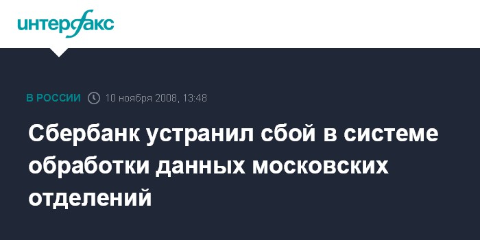 Москва. 10 ноября. INTERFAX.RU - Сбербанк России сообщил, что сбой в системе обработки вкладов некоторых московских отделений банка, произошедший 7-8 ноября, полностью ликвидирован, и работа системы обработки данных банка полностью восстановлена.