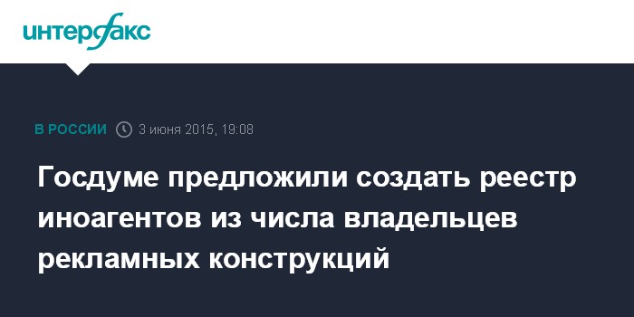 Москва. 3 июня. INTERFAX.RU - В Госдуму внесен законопроект о создании реестра иностранных агентов - владельцев рекламных конструкций.