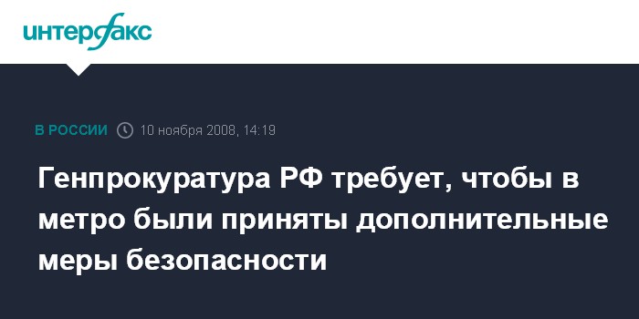 Представитель Генпрокуратуры отметила также, что прокуроры субъектов РФ провели проверки в этой связи соблюдения прав граждан, пользующихся услугами метрополитенов. "Результаты проверок свидетельствуют о необходимости незамедлительного принятия дополнительных мер по обеспечению безопасности пассажиров и защите их прав", - подчеркнула Гриднева.
