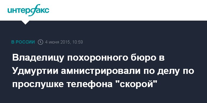 Москва. 4 июня. INTERFAX.RU - Глазовский суд Удмуртии вынес обвинительный приговор директору ритуального агентства, работники которого прослушивали телефон местной "скорой", однако дело было прекращено в связи с амнистией в честь 70-летия Победы в Великой Отечественной войне.