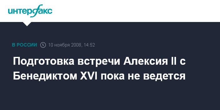 Москва. 10 ноября. INTERFAX.RU - В Русской православной церкви заявили, что подготовка встречи патриарха Московского и всея Руси Алексия II с папой Римским Бенедиктом XVI пока не проводится.