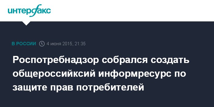 Москва. 4 июня. INTERFAX.RU - Роспотребнадзор разработал проект концепции государственной политики РФ по защите потребителей до 2025 года, говорится в государственном докладе ведомства "Защита прав потребителей в РФ в 2014 году". В том числе, в России предполагается создать открытый общегосударственный информационный ресурс в области защиты прав потребителей, качества и безопасности продукции.