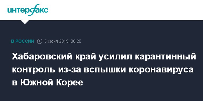 Москва. 5 июня. INTERFAX.RU - Вспышка ближневосточного респираторного синдрома коронавируса в Республике Корея диктует усиление мер санитарно-карантинного контроля в Хабаровском крае, сообщает пресс-служба управления Роспотребнадзора по региону в пятницу.