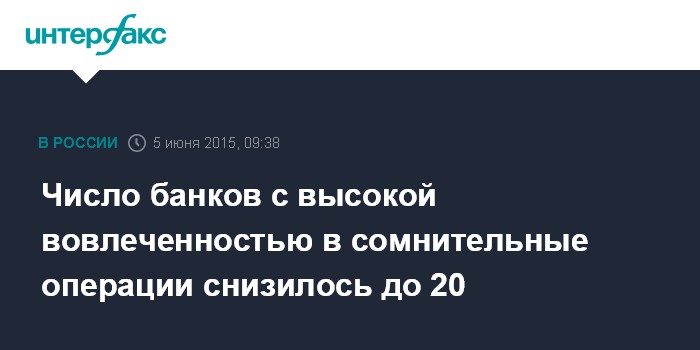 Москва. 5 июня. INTERFAX.RU - Число банков с высоким уровнем риска вовлеченности в проведение сомнительных операций снизилось, сейчас в РФ работают не более 20 таких кредитных организаций, сказал журналистам зампред ЦБ РФ Дмитрий Скобелкин.