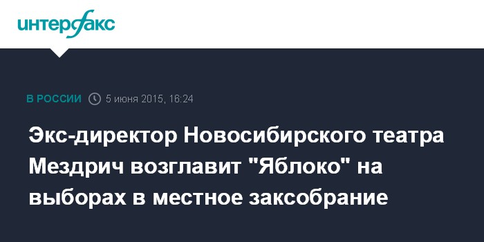 Москва. 5 июня. INTERFAX.RU - Бывший директор Новосибирского театра оперы и балета Борис Мездрич возглавит список партии "Яблоко" на выборах в законодательное собрание Новосибирской области, говорится в сообщении партии, поступившем в "Интерфакс" в пятницу.