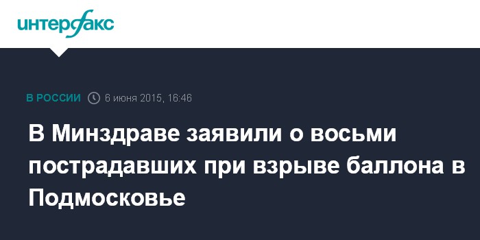 Москва. 6 июня. INTERFAX.RU - Число детей, пострадавших в результате взрыва газового баллона в Московской области, составило восемь человек, сообщили "Интерфаксу" в субботу в пресс-службе регионального Минздрава.